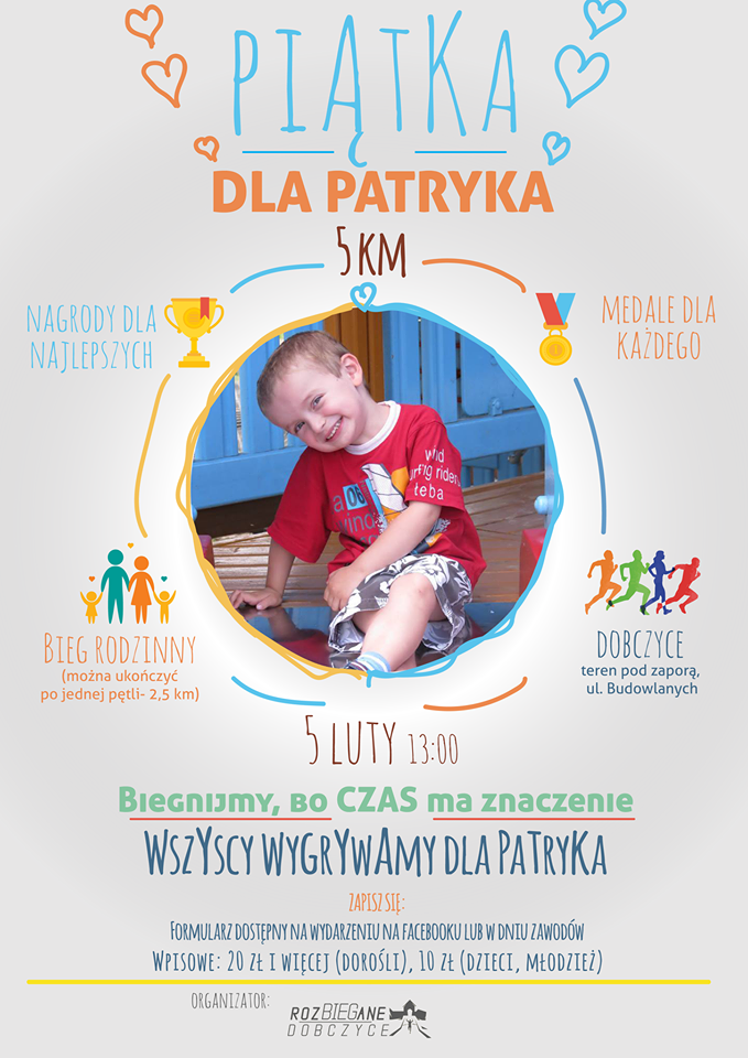 „Mamo, czy ja będę żył? To nie jest pytanie, które zadają 6-letnie dzieci. Patryk nie jest zwyczajnym dzieckiem, ma raka, śmiertelną chorobę, która rozwija się w jego głowie. W swoim krótkim życiu widział więcej bólu, śmierci i cierpienia niż niejeden dorosły. Dzisiaj, mimo tego, że ma dopiero kilka lat, chce wiedzieć, czy ma jakiekolwiek szanse, by żyć. Na walkę o niego mamy tylko miesiąc. Jeśli do 18 lutego nie zdoła stawić się w klinice w USA – umrze.” My biegacze wiemy jak ważne jest słowo CZAS. Często mówimy o tym, że walczymy o jak najlepszy czas albo walczymy z czasem. Tu słowo to ma zupełnie inny wymiar. Niejednokrotnie używamy też słowa „ŻYCIÓWKA”. Mówimy, że osiągnęliśmy, zrobiliśmy „życiówkę”. Chcemy wszystkich prosić o włączenie się do walki z CZASEM i o wspólną ŻYCIÓWKĘ dla Patryka, mieszkańca Dobczyc, którego jedyną szansą by żyć i być wśród nas jest kosztowna operacja w USA.